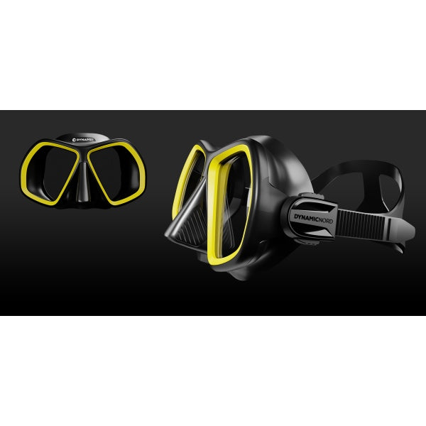 The DynamicNord Mask Panorama in black silicone with yellow accents offers a sleek, durable design ideal for extended wear. Crafted from high-quality silicone, it ensures a comfortable, secure fit while providing effective protection. Its vibrant yellow detailing enhances visibility and style, making it a practical choice for professionals seeking both functionality and modern aesthetics.