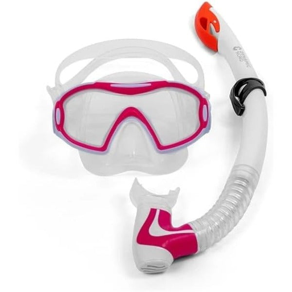 The Dynamic Nord Snorkeling Set Junior MSJ-10 includes a single-lens mask and a snorkel, both designed in a clear, pink, and white color scheme. This set comes in one universal size, making it suitable for young snorkelers. The mask offers clear vision underwater, while the snorkel allows for easy breathing, providing a comfortable and reliable snorkeling experience for beginners.